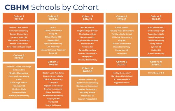 CBHM launched during the 2012-13 school year in 10 Boston Public Schools (BPS). Each year, approximately 10 additional schools join the model. Currently, 76 schools have joined CBHM. Each participating school has begun to implement a multi-tiered model of interventions and supports (aka MTSS), including a universal social emotional learning curriculum and a universal behavioral health screening tool (BIMAS-2), which helps schools better understand and respond to each student's behavioral health needs.